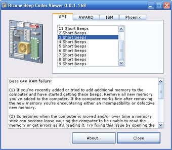 Rizone Beep Codes Viewer incluye códigos de pitido para placas de AMI, AWARD, IBM y Phoenix. Además de su significado, el texto incluye indicaciones a seguir para solucionar cualquier problema asociado al peculiar sonido.